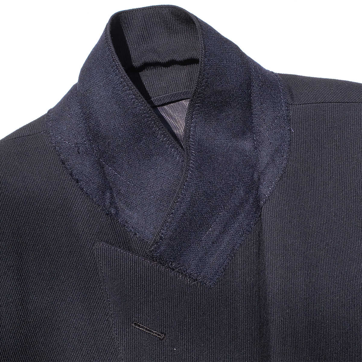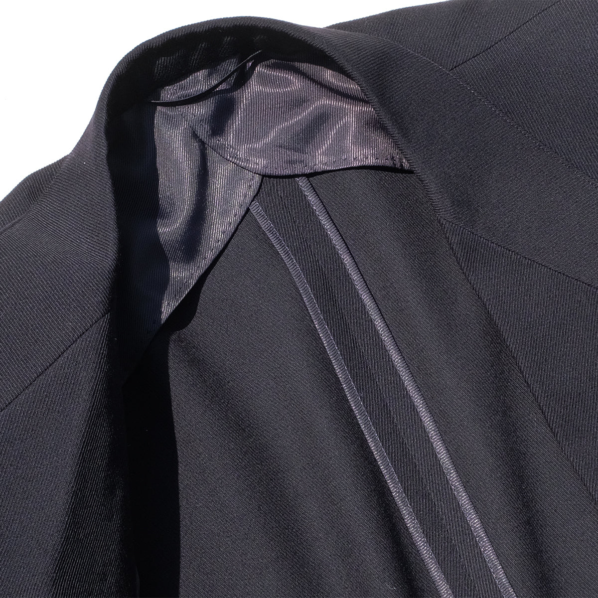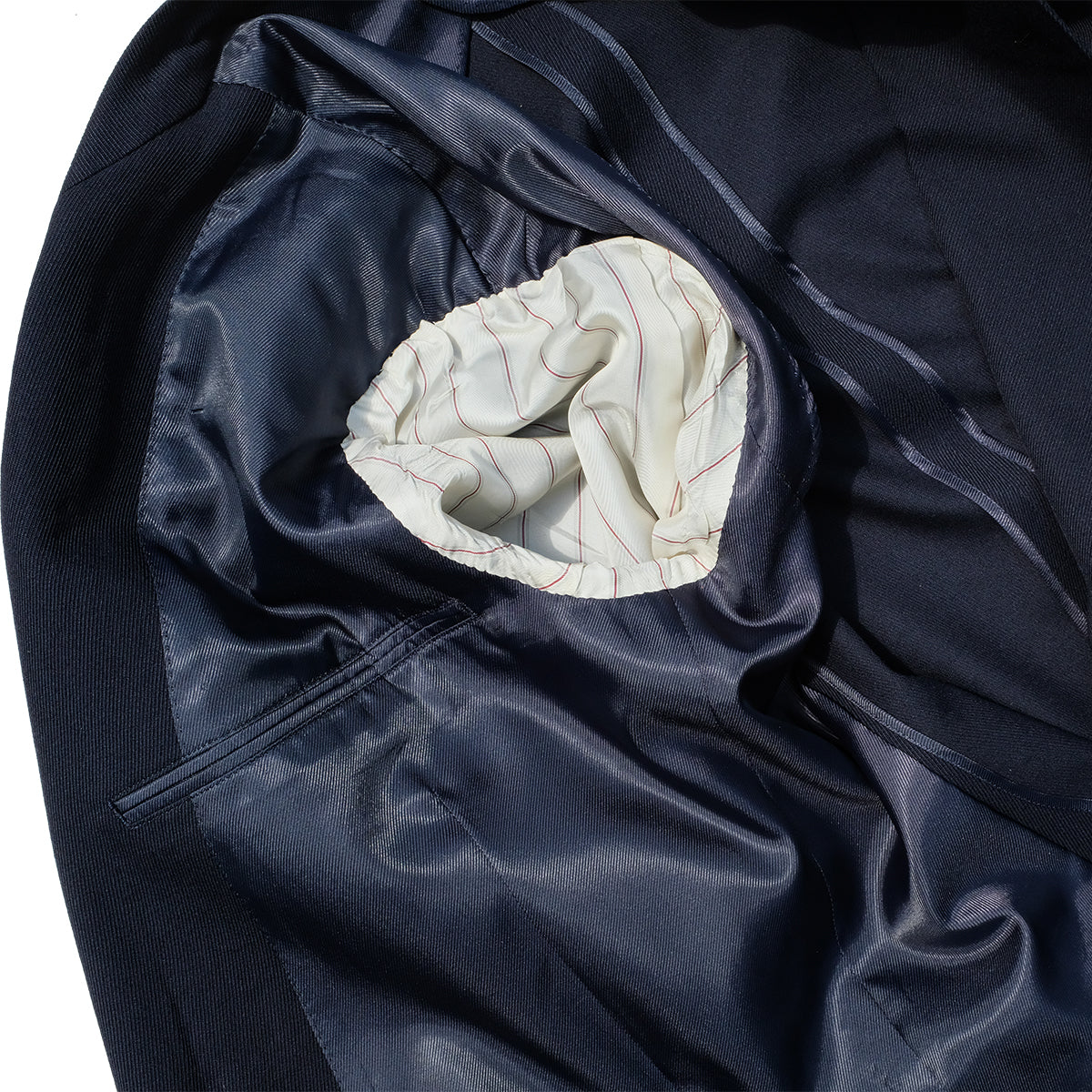The jacket is fully lined with wool interlining from the lapel under the upper collar to the hem. Nowadays, most jackets use adhesive interlining to reduce costs in areas that are not visible, but considering the beauty of the jacket and how it fits the body the more it is worn, wool interlining was essential. Different types of wool interlining are used in different parts, and layered to create a three-dimensional shape that beautifully hugs the silhouette of the body.