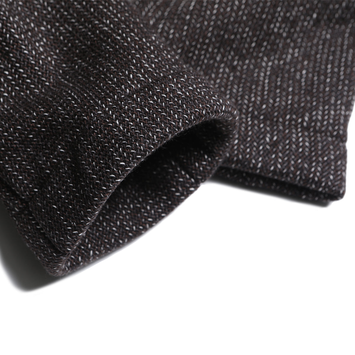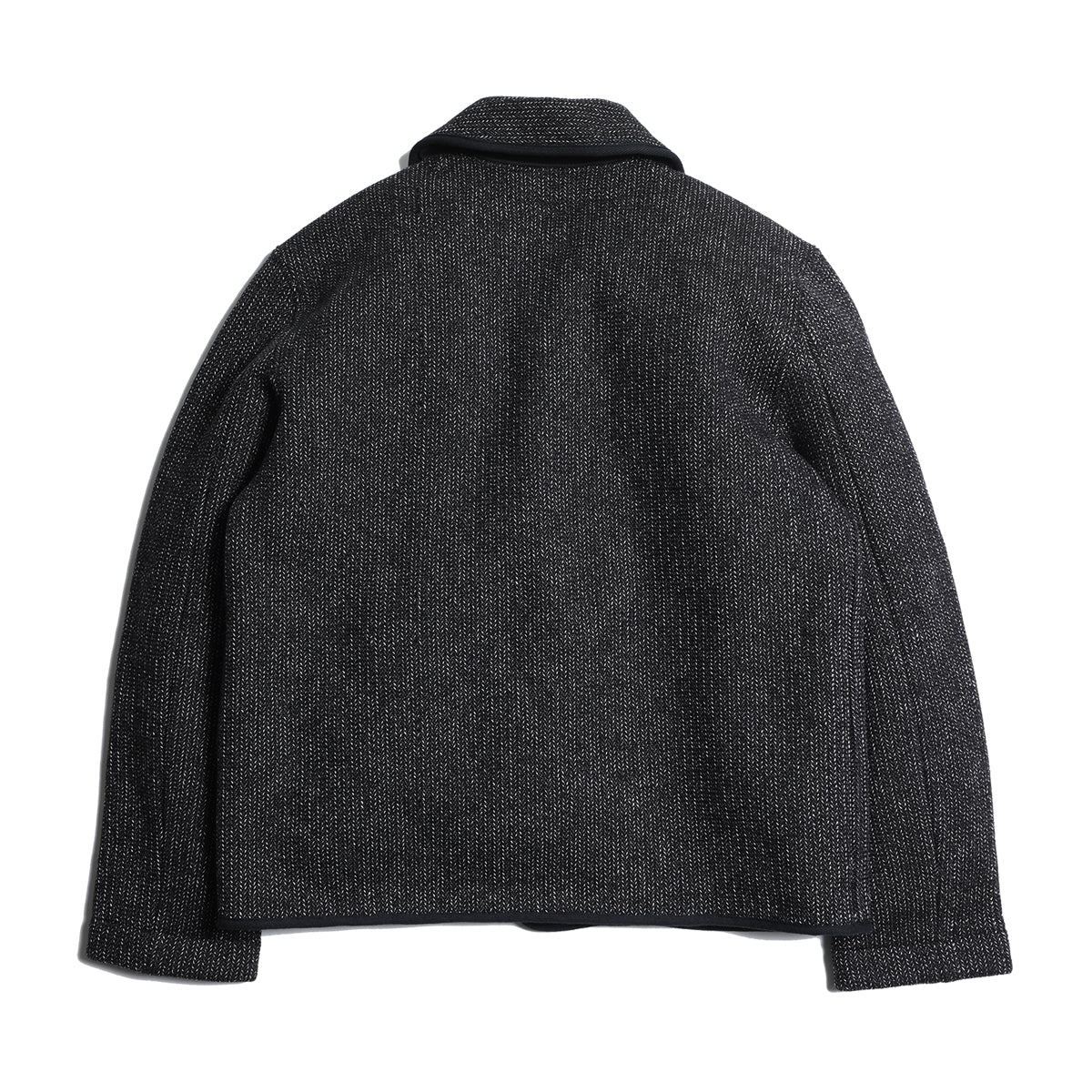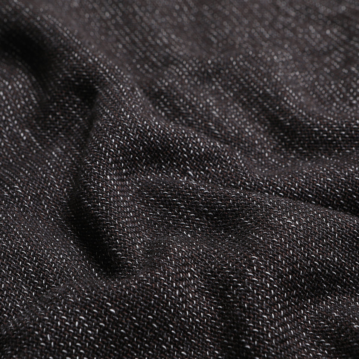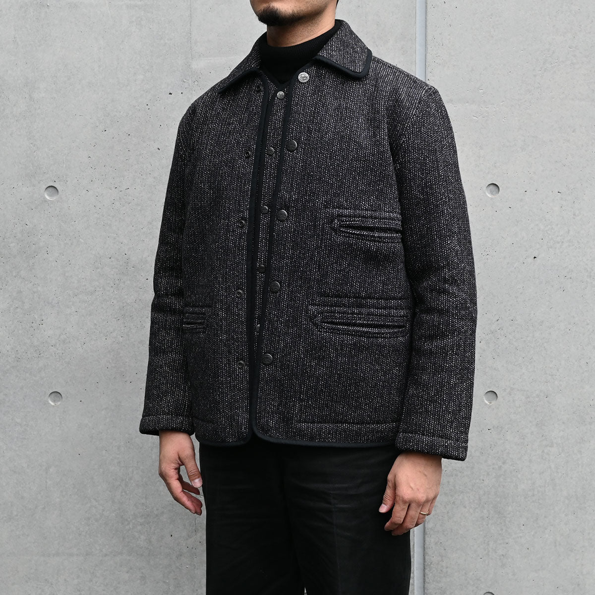 The surface is made by twisting together two different color yarns of different counts. The commonly known "sesame salt" finish is used to recreate the atmosphere of the time and create a deep, expressive look.