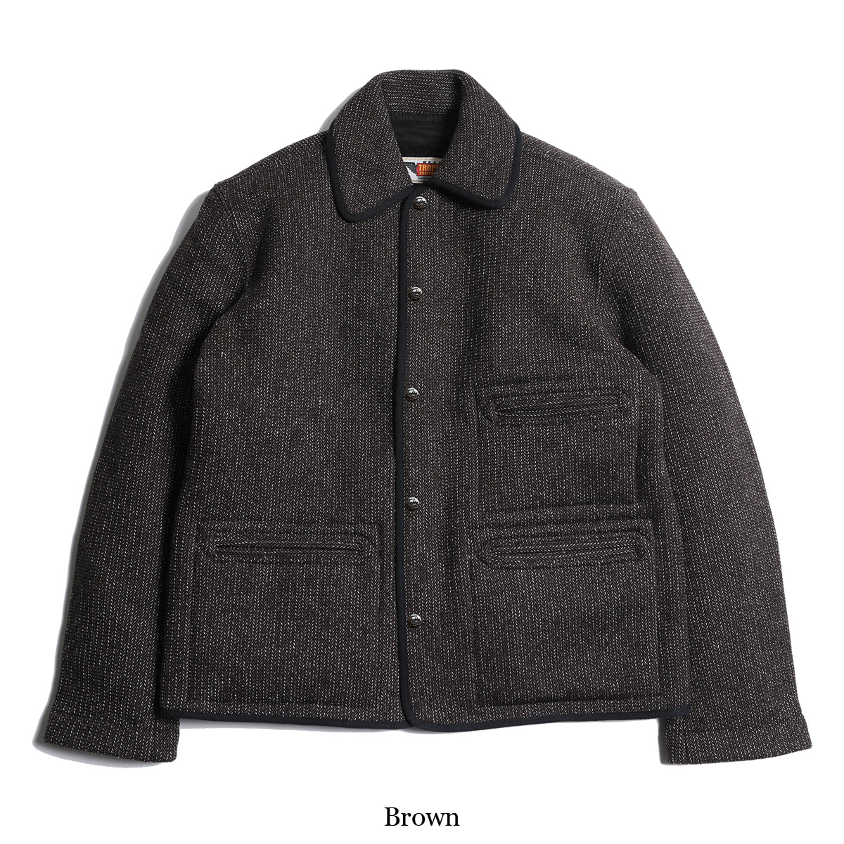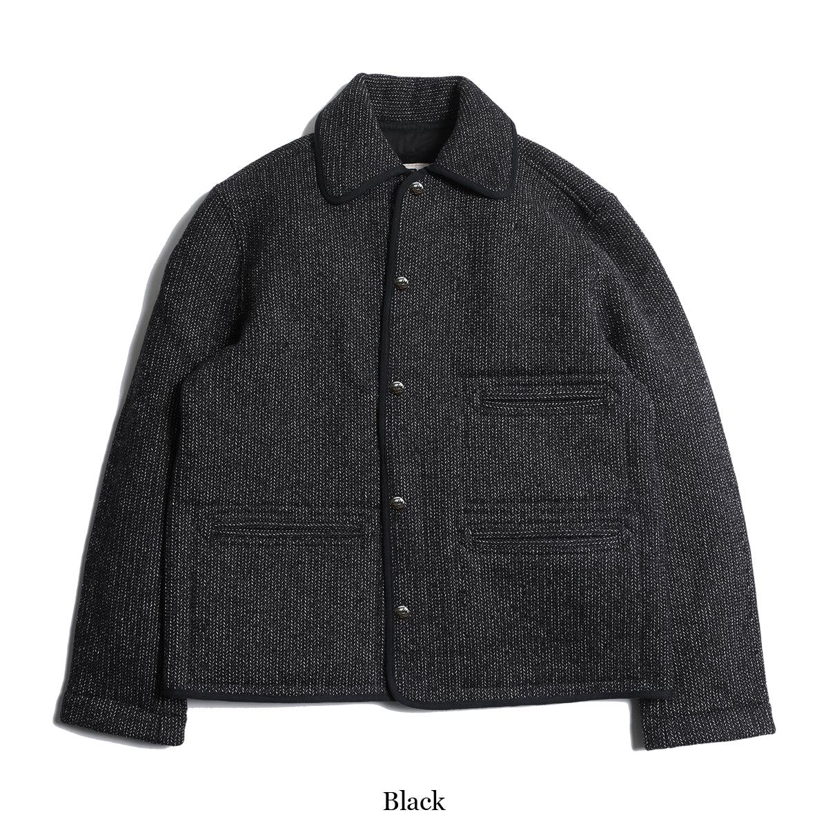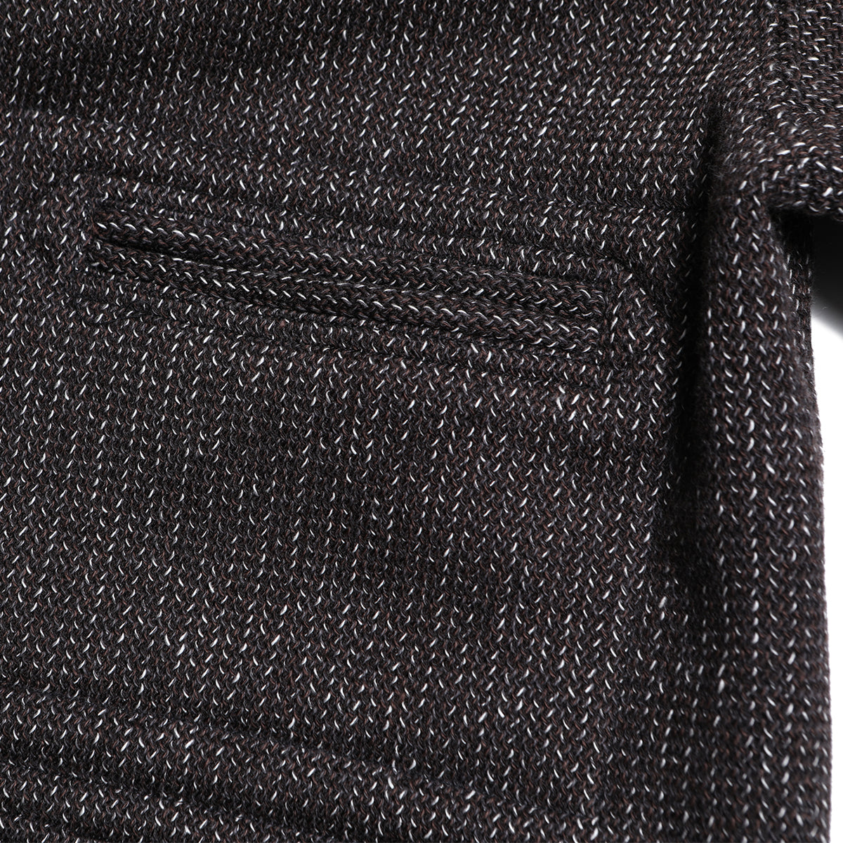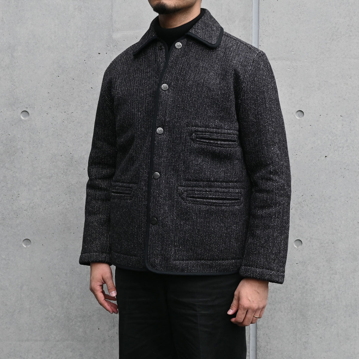 The surface is made by twisting together two different color yarns of different counts. The commonly known "sesame salt" finish is used to recreate the atmosphere of the time and create a deep, expressive look.