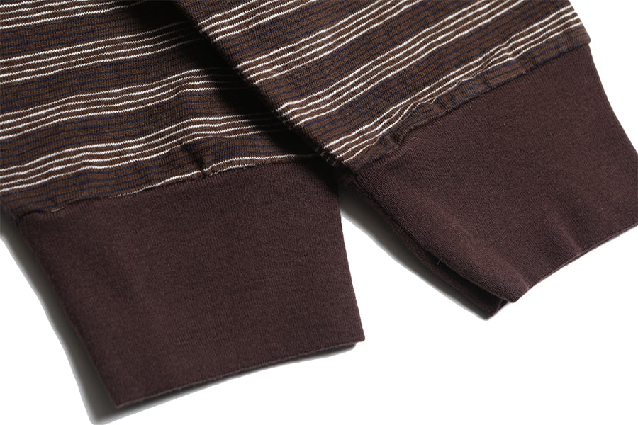 There is no stitching on the neck ribbing, the cuffs are ribbed, and the hem is sewn with a narrow twin needle stitch.