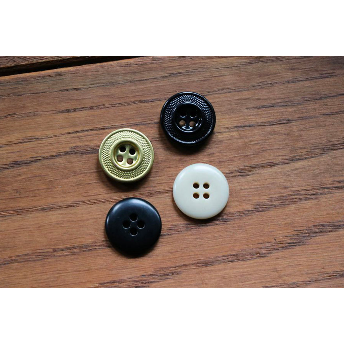 Solid black 4-hole buttons, solid white 4-hole buttons, gold plated buttons, black plated buttons.
