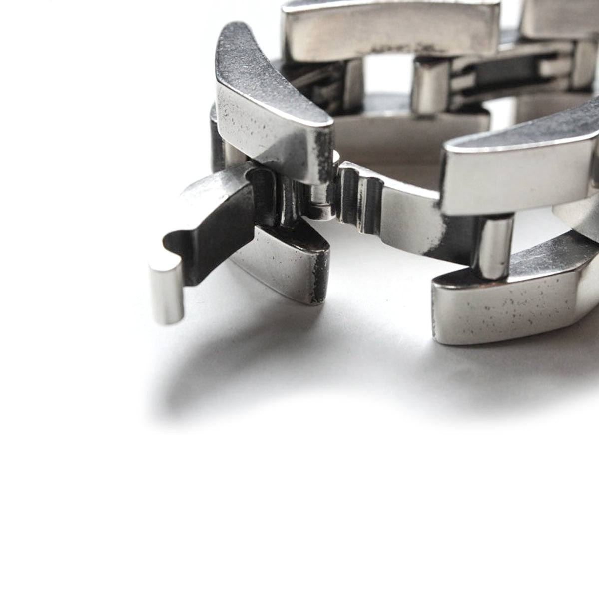 It features a more voluminous and edgy shape than the Watch Bracelet.