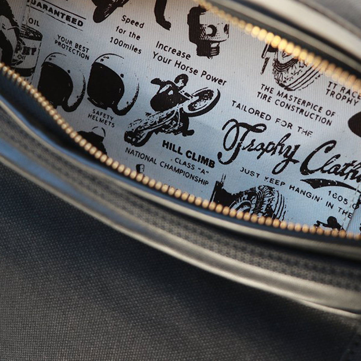 The bottom gusset is wide enough to secure necessary and sufficient capacity for personal items such as wallets and notebooks, tools, and tool rolls. The interior is made of original textile with a motorcycle image, and the double-sided W zipper on the main zip has a leather strap so that it can be easily opened and closed even when wearing gloves.