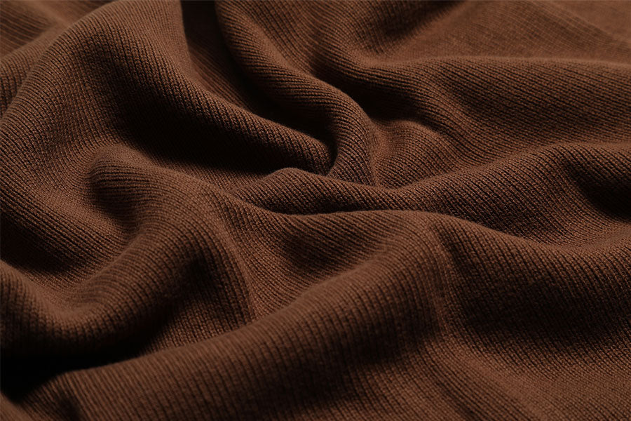 特殊な編み機で表面は太番手でセーターライク、裏面は天竺編みで表現しています。
