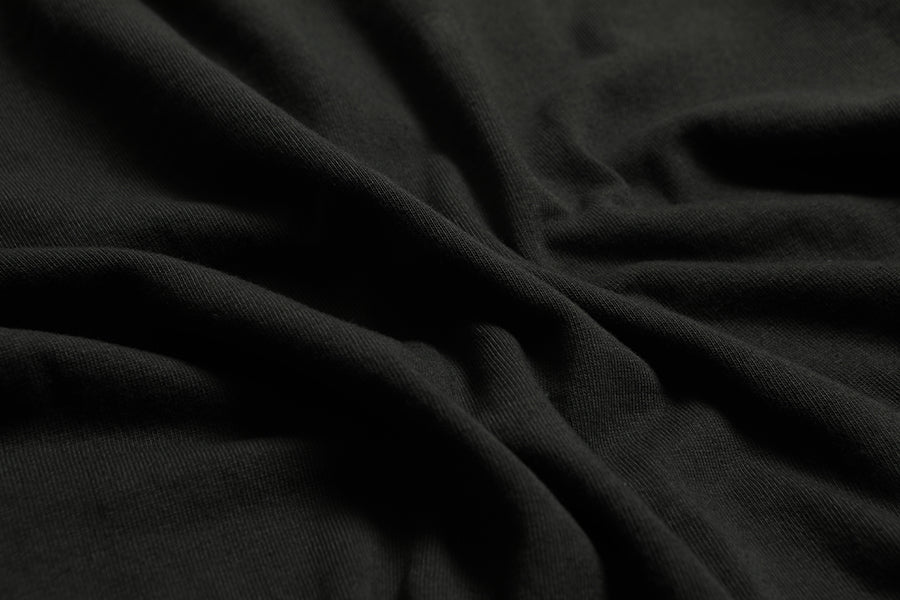 The jersey is knitted with different thicknesses of yarn: 20-count single yarn on the front and 30-count single yarn on the back. The binder hem is reinforced with three stitches, two on the neck and one on the body, to prevent stretching.