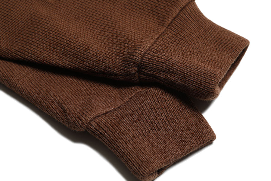 特殊な編み機で表面は太番手でセーターライク、裏面は天竺編みで表現しています。