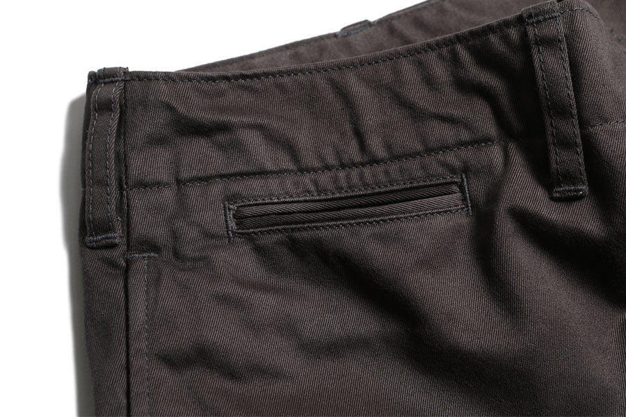 サイドシーム上に配したスラッシュポケット、バックは細巻きした 両玉縁ポケット、 股下は運動量を確保する三角マチで切り替えています。