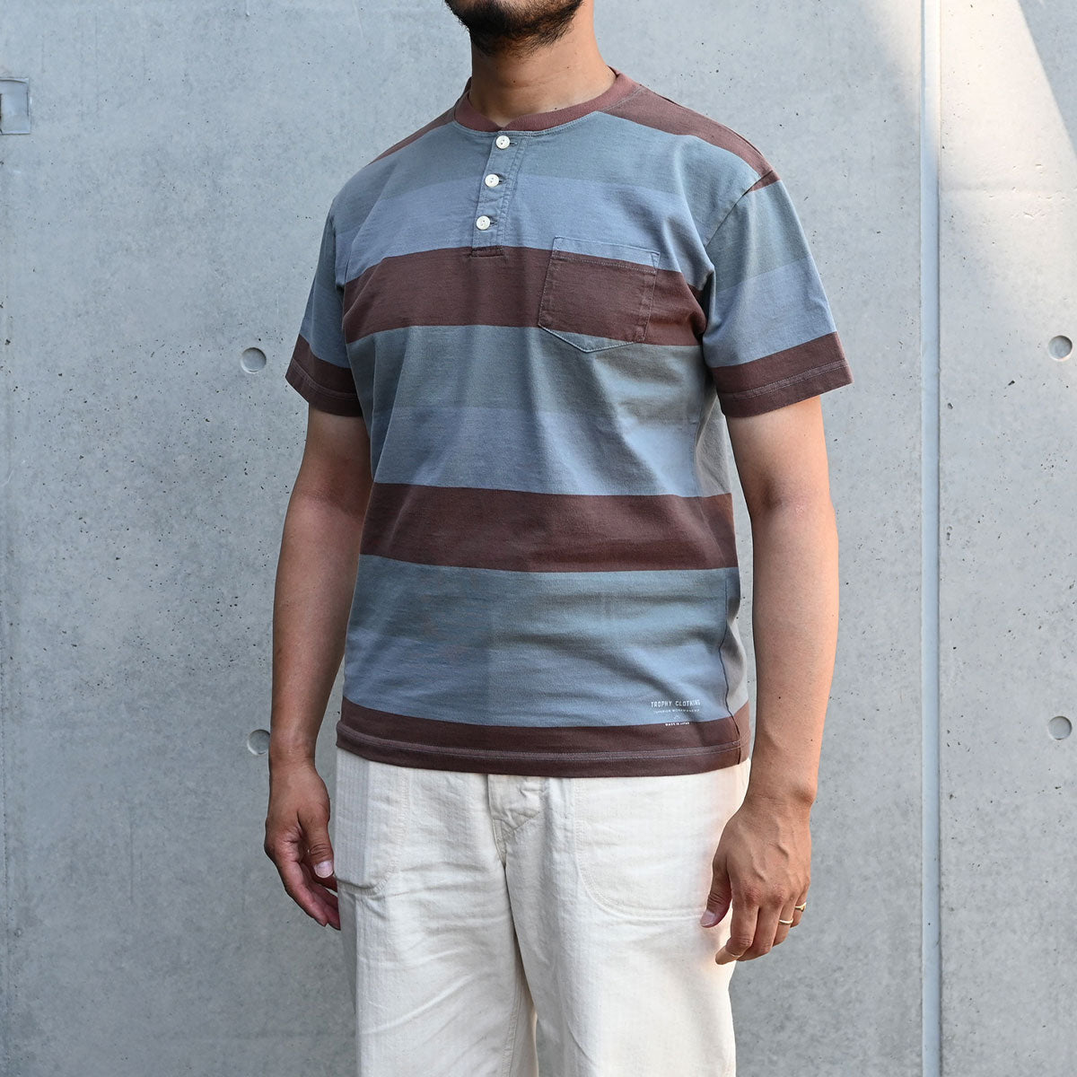 ヘンリーネックは一枚での着用はもちろん、ワークシャツやデニムジャケットのインナーにお薦めの一枚。