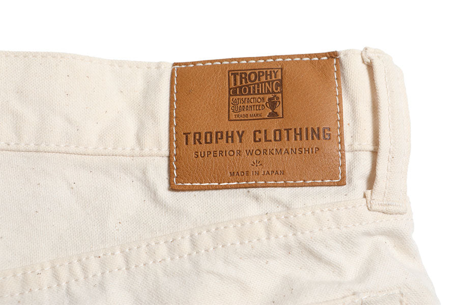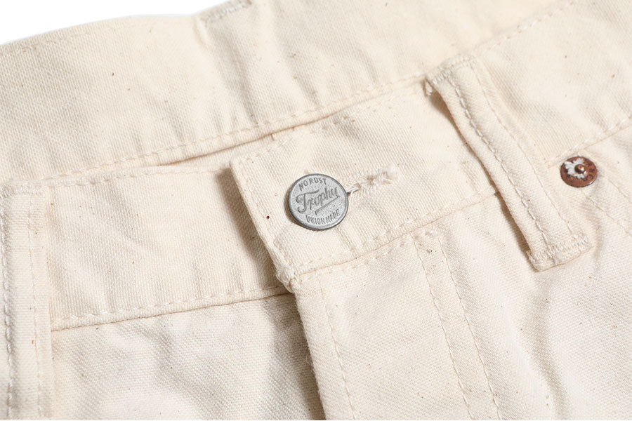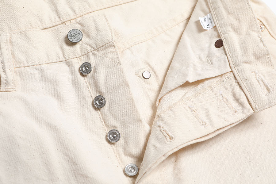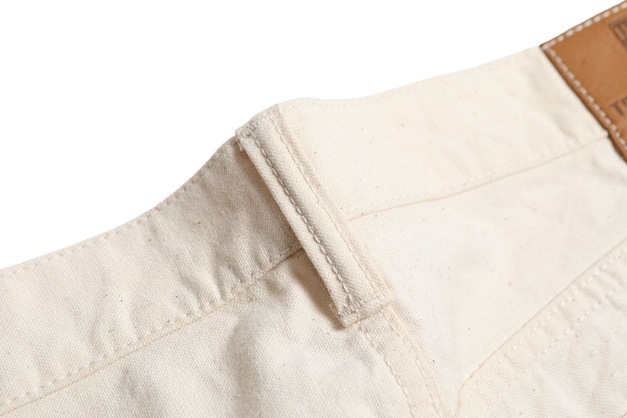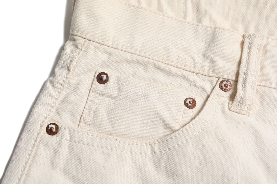 隠しリベット付きバックポケット、生成りスレキ、刻印入り打ち抜きリベット、ディアスキン革パッチを採用。