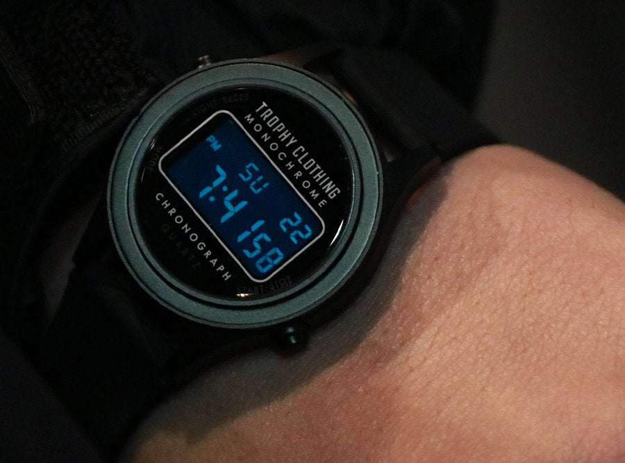 デジタルウォッチでは珍しいラウンド型(丸型)の時計本体に、ライト、アラーム、ストップウォッチの3つの機能を搭載したムーブメントを内蔵。