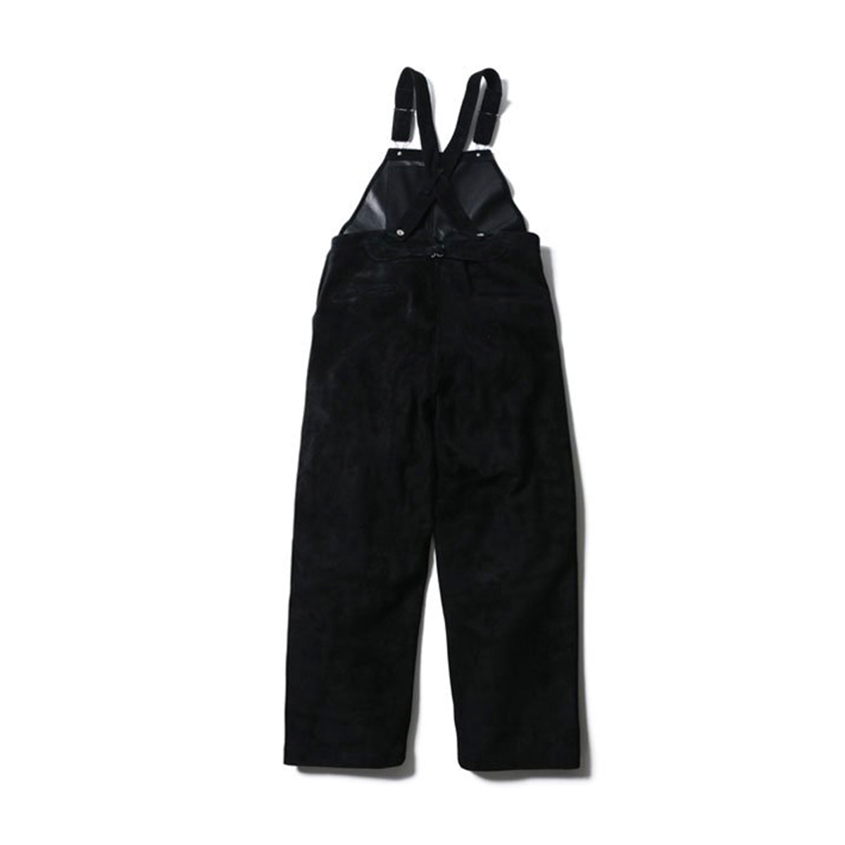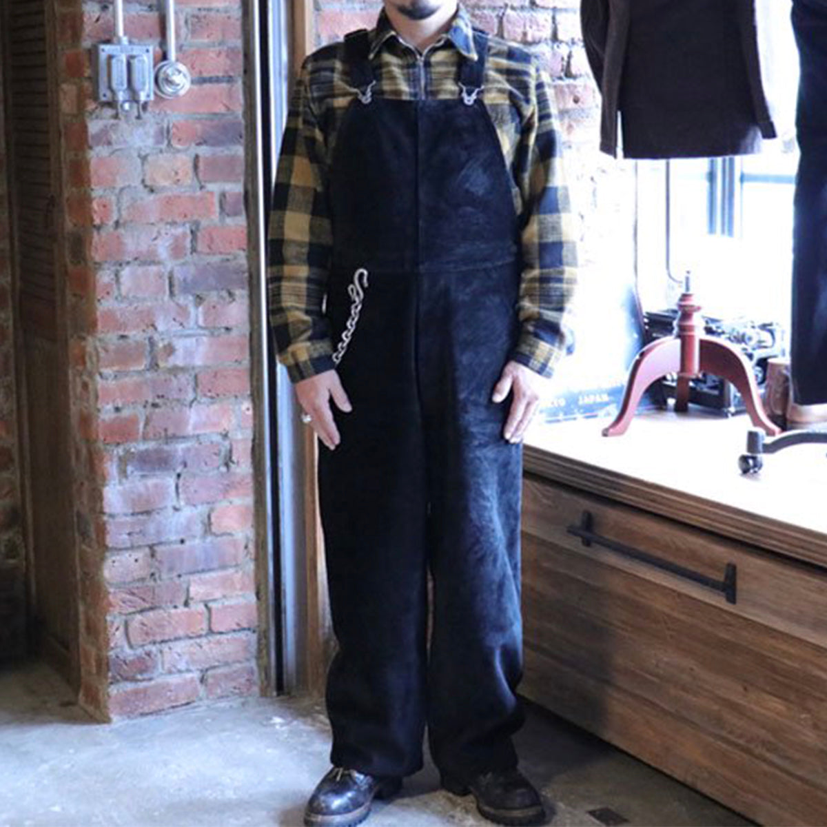 アメリカ・テキサス産のステアオイルレザーを贅沢に裏使いしたラフアウトローバックオーバーオール。